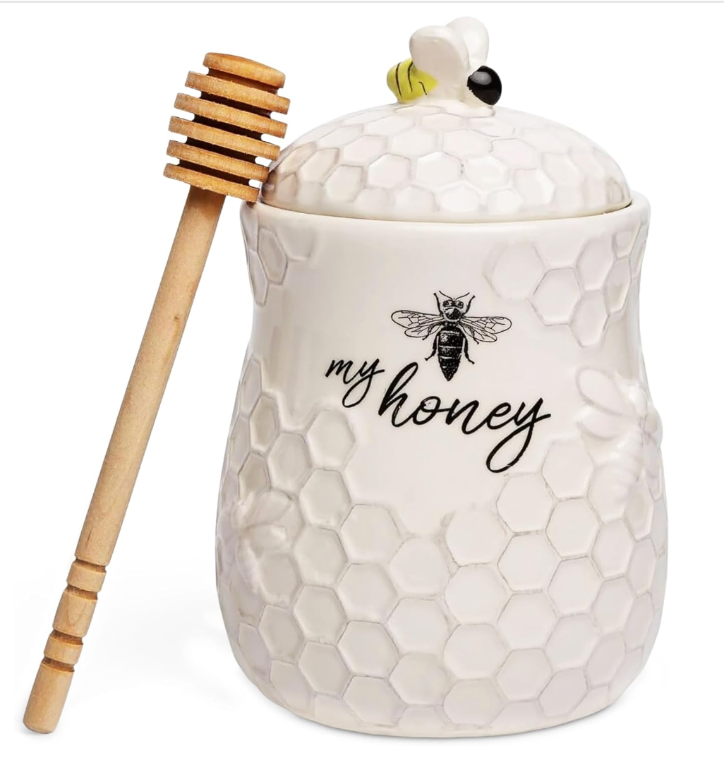 HONEY JAR AND DIPPER SET: Our white honey bee jar is made of ceramic and features an embossed honeycomb design with bees and 'My honey' graphic text in black. The lid includes a bumble bee, and the cute set provides a wood honey dipper. Perfect for keeping honey.