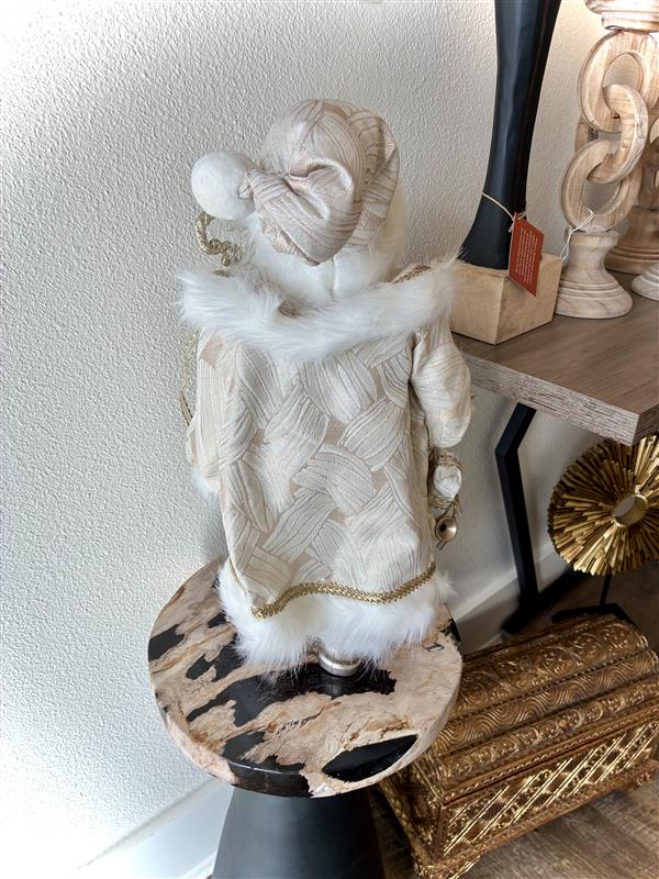 Santa dressed in all white and holding a staff and his sack of presents. 17"